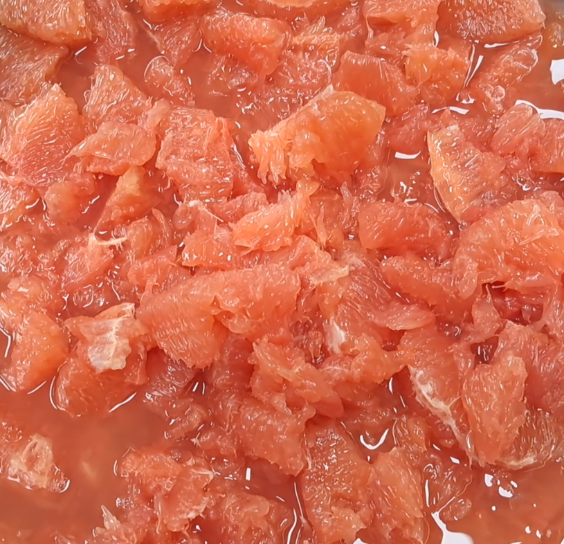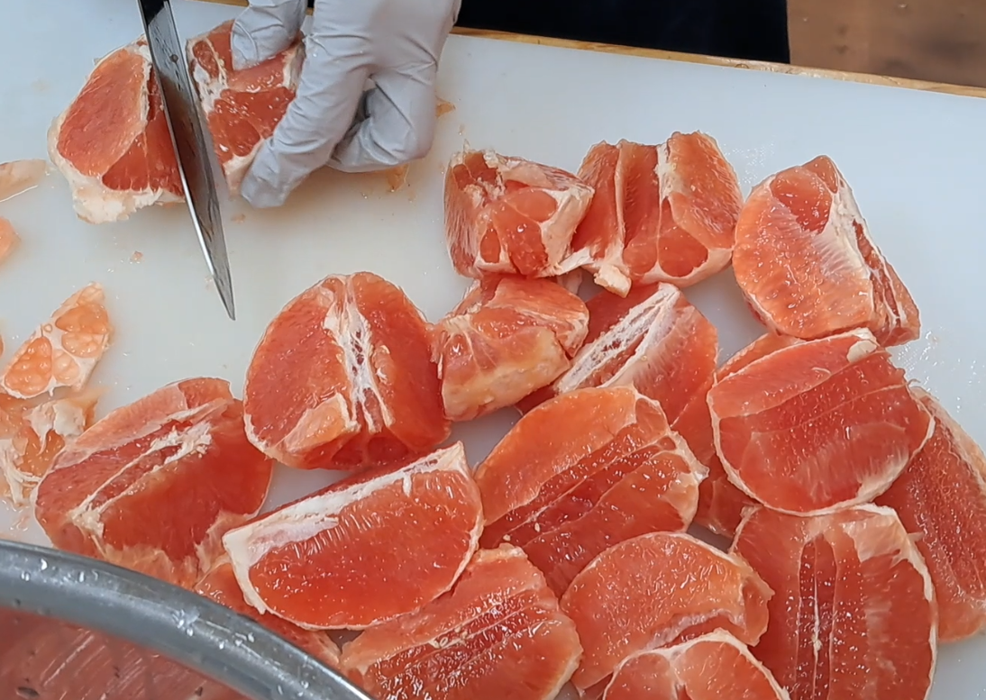 5. 손질된 자몽알맹이들과 설탕의 비율을 1:1로 알갱이가 다치지 않도록 부드럽게 섞습니다.